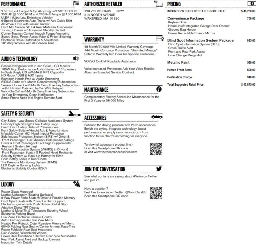 Leather Seats, Navigation, Sunroof, All Wheel Drive, Back-Up Camera, Satellite Radio, iPod/MP3 Input, CD Player, Onboard Communications System, Aluminum Wheels, Dual Zone A/C, WiFi Hotspot, Brake Actuated Limited Slip Differential, Smart Device Integration, Heated Leather Seats. MP3 Player, Steering Wheel Controls, Child Safety Locks, Electronic Stability Control, Heated Mirrors. Volvo T5 Premier with Flamenco Red Metallic exterior and Off-Black interior features a 5 Cylinder Engine with 250 HP at 5400 RPM*. Reduced from $14,998.